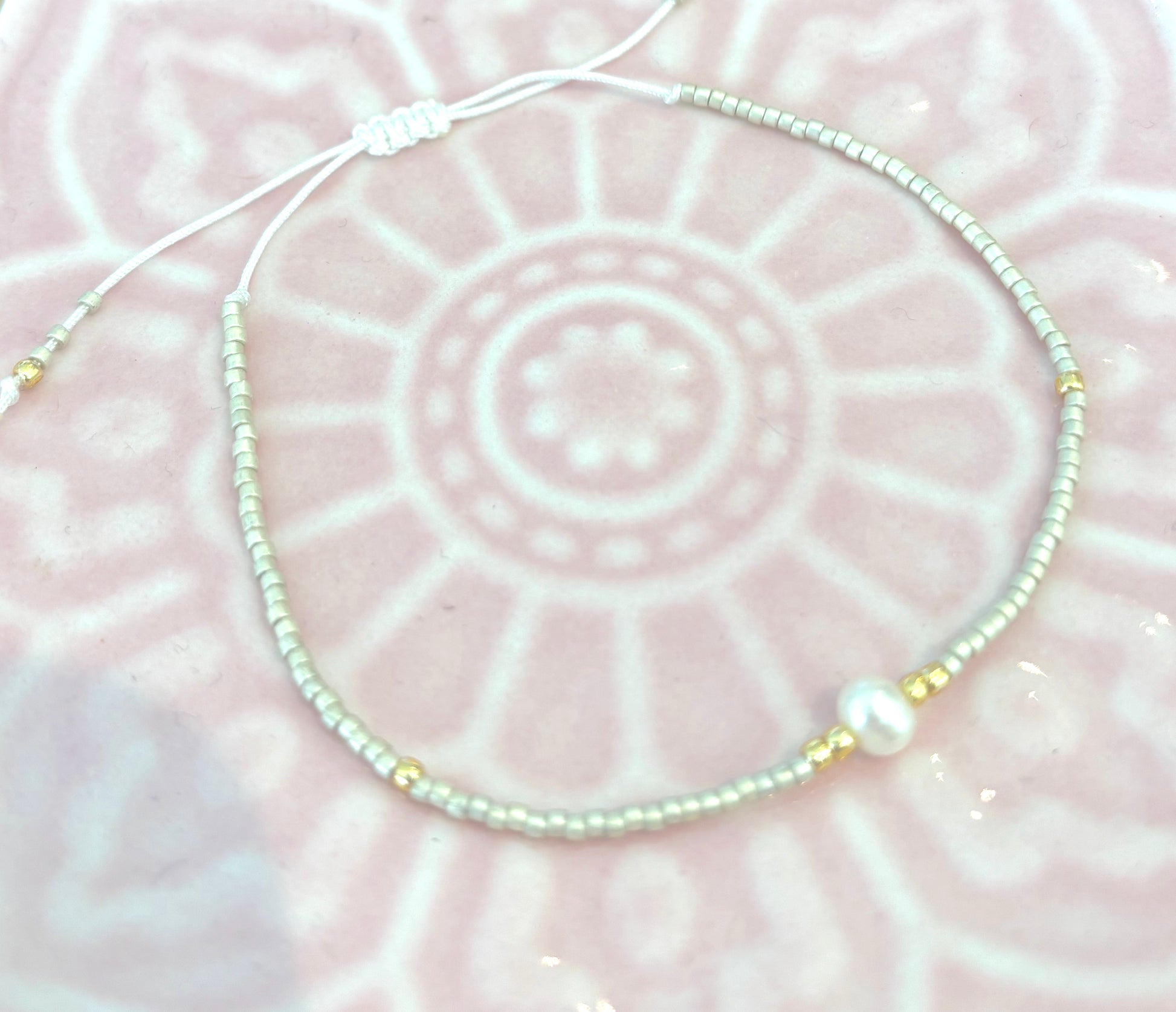 The delicate freshwater pearl with subtle gold details makes this bracelet a true statement. Wear it on its own or layered. Handmade with the highest quality Japanese Miyuki beads & the softest of silk thread. Fully adjustable to 29cm long.