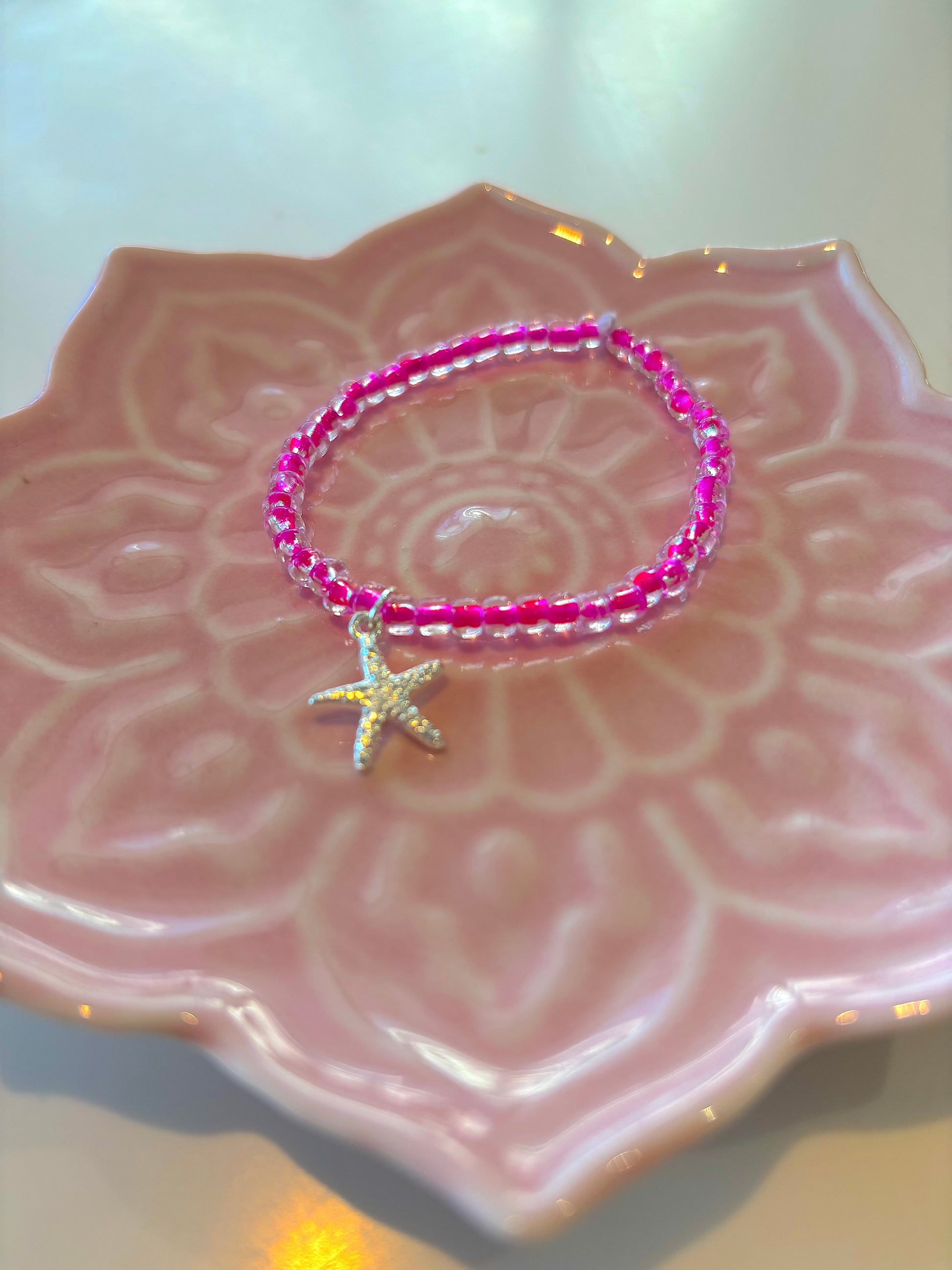 Bright Pink beaded bracelet with silver starfish pendant (made by bKind)