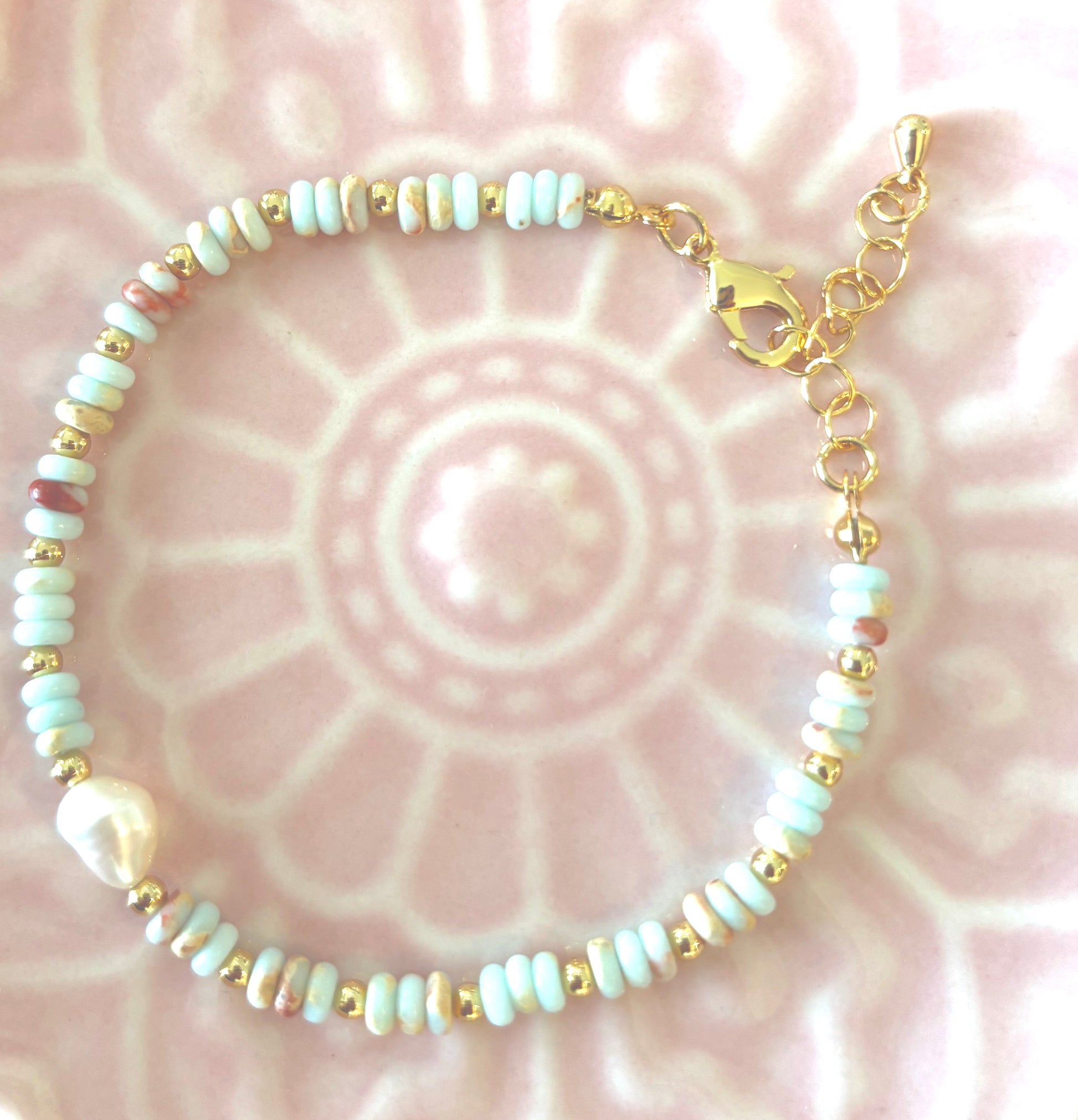 Bohemian Style Multicolour Natural Stone And Freshwater Pearl Bracelet, 18k Gold Plated with gold clasp